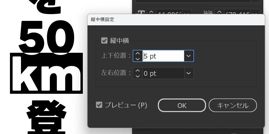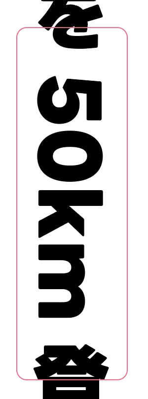 山路を50km登りながら ”の場合50とkmは個別に横にしたくなります。横にしたい文字が連続する場合、ちょっとコツが必要です。