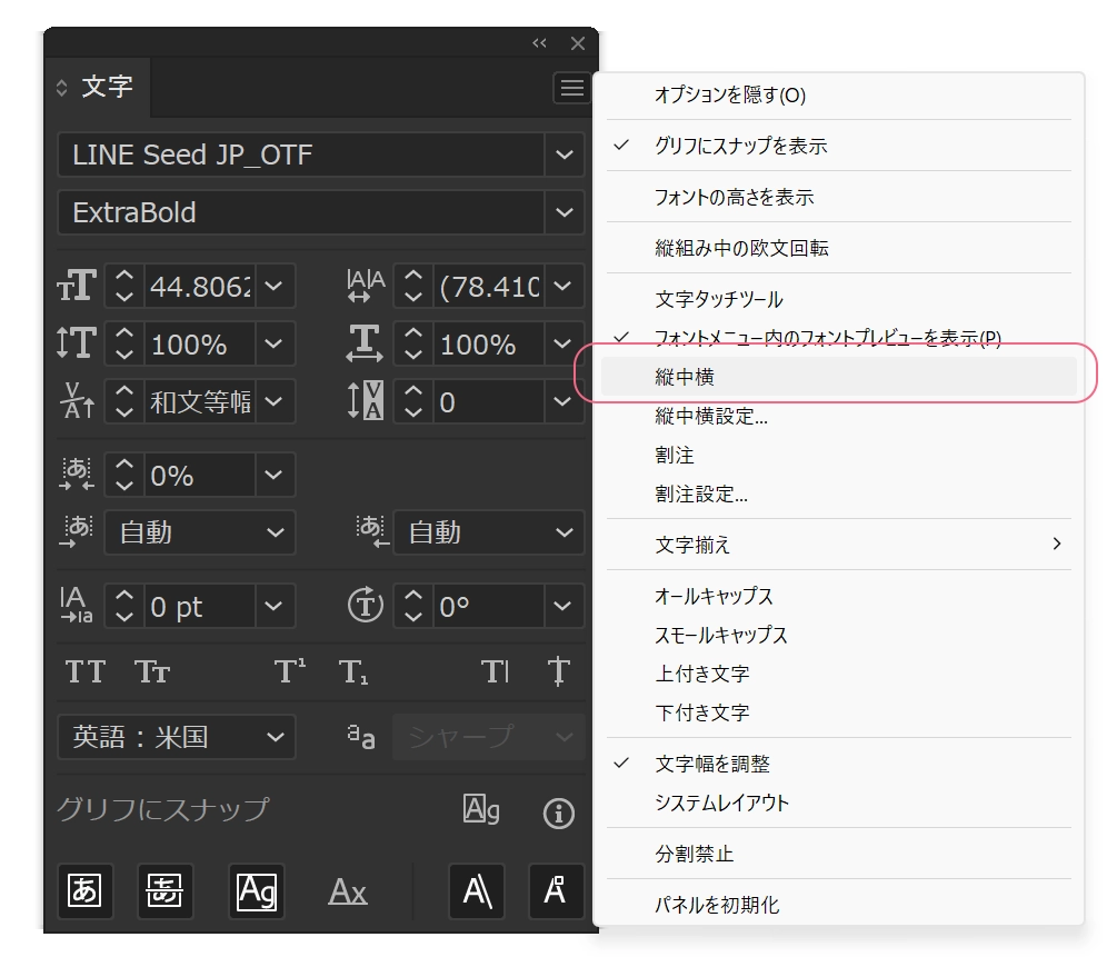 Illustratorには縦中横にさらなるオプションが用意されています。文字ウィンドウパネルメニューから縦中横設定… を選択します。